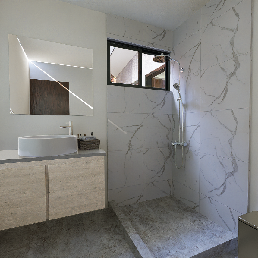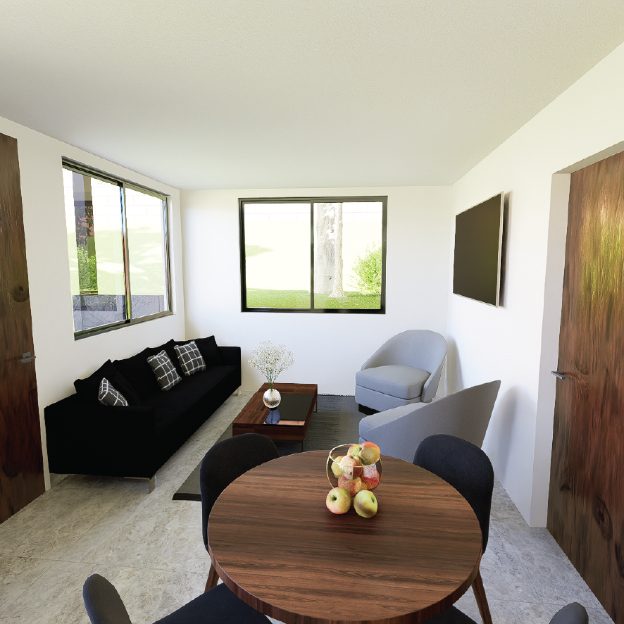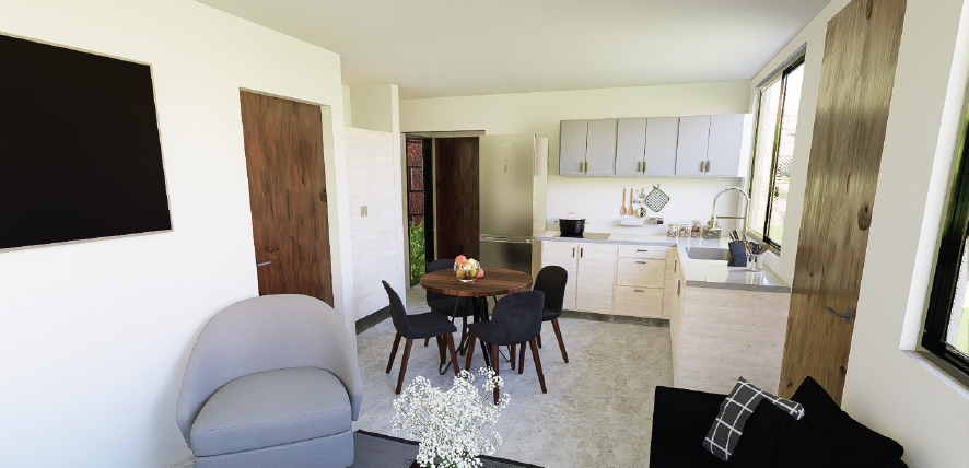 El área social integra cocina, sala y comedor en un único ambiente abierto, aprovechando al máximo la luz natural y garantizando una ventilación constante. El dormitorio principal cuenta con un armario empotrado de generosas dimensiones y un baño completo, bien iluminado y ventilado gracias a ventanas estratégicas. Un baño de visitas adicional y una pequeña zona de lavandería completan el programa de usos.
