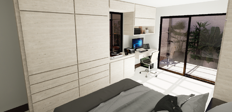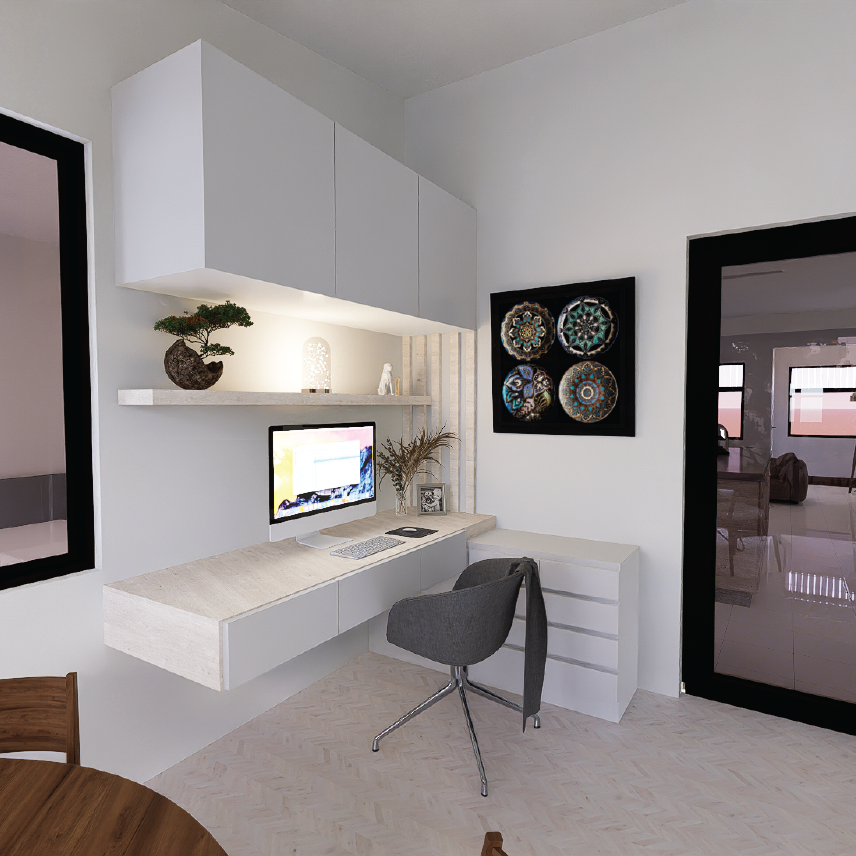 Multifuncionalidad y Privacidad: El área de terraza y lavandería fue completamente reinterpretada para albergar múltiples programas: desde una oficina técnica para el trabajo en casa hasta un rincón de lectura y un espacio social independiente para el esparcimiento. En la zona privada, la habitación principal se dotó de un medio baño adicional y mobiliario a medida para potenciar la capacidad de almacenamiento, mientras que el cuarto secundario fue actualizado para adaptarse a las necesidades de independencia y crecimiento de la hija.