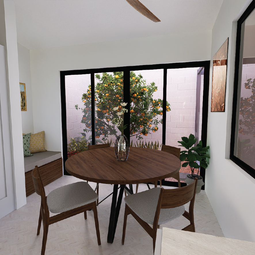 Concepto y Áreas Sociales: El núcleo de la intervención en Casa Zúñiga Ruíz fue la liberación del espacio. Al eliminar el comedor tradicional, se dio paso a una cocina expandida con una isla de gran escala que asume el rol de centro social y funcional. Esta estrategia no solo moderniza la estética de la vivienda, sino que optimiza el flujo diario, permitiendo que el mobiliario de diseño se convierta en la herramienta principal para maximizar cada metro cuadrado.