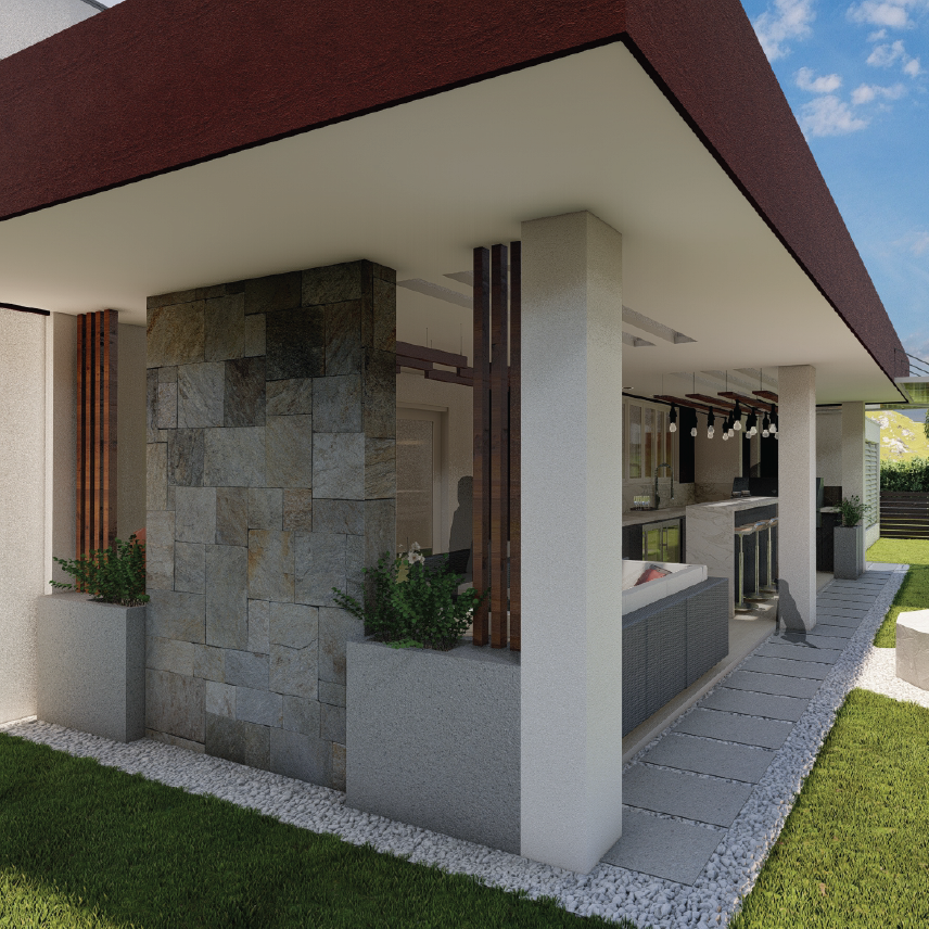 La materialidad juega un papel fundamental en la identidad del proyecto: se combina la textura natural de detalles en madera con la robustez del concreto lujado en maceteras coladas en sitio. Una pérgola de estructura metálica con cubierta esmaltada blanca garantiza el confort climático, mientras que el diseño de iluminación técnica y decorativa —que integra lámparas colgantes y extensiones de luces tipo "feria"— define escenarios versátiles para el uso nocturno. La zonificación se organiza inteligentemente para incluir una barra de bar ergonómica y una estación de BBQ, integrando de forma discreta y funcional las áreas de lavandería y bodega.
