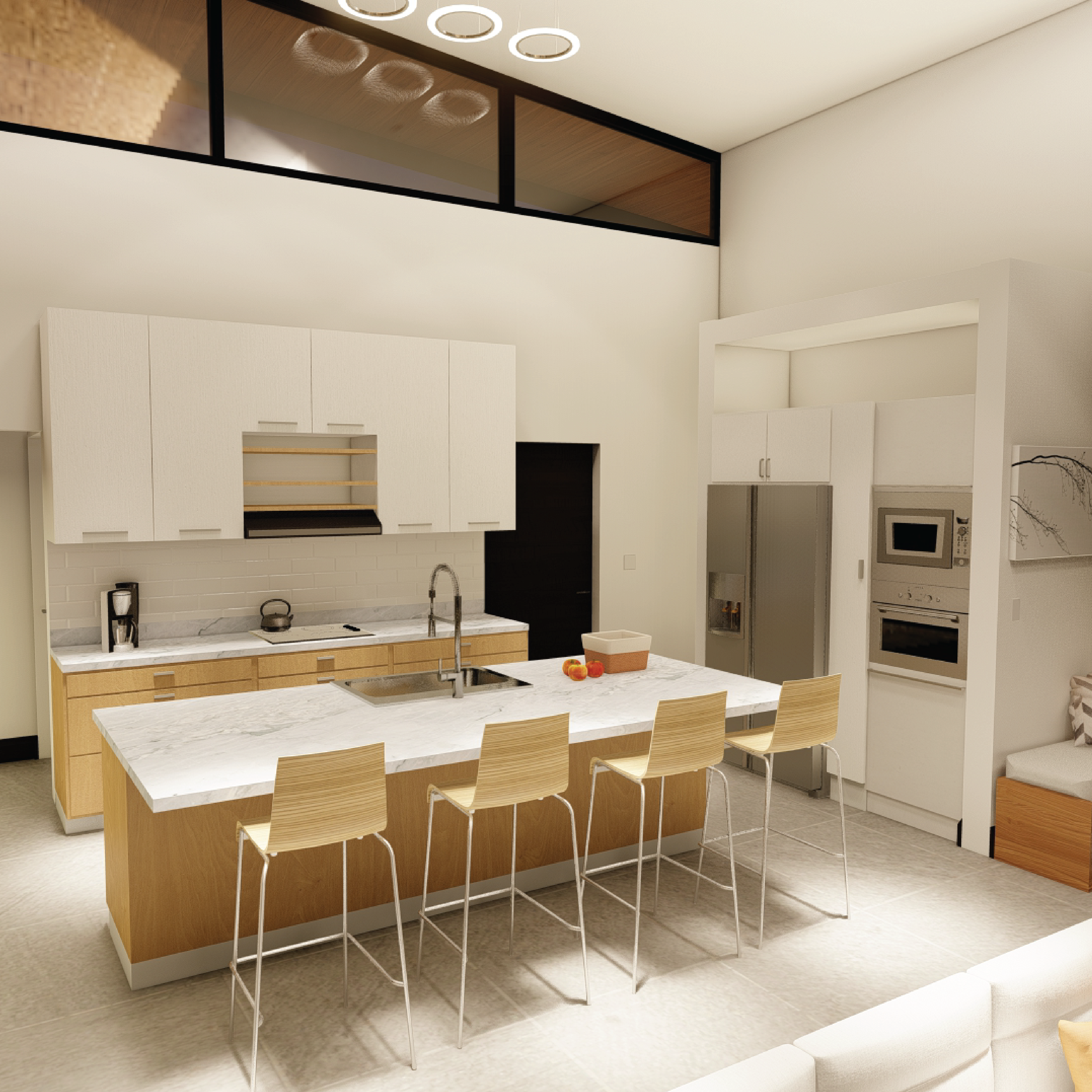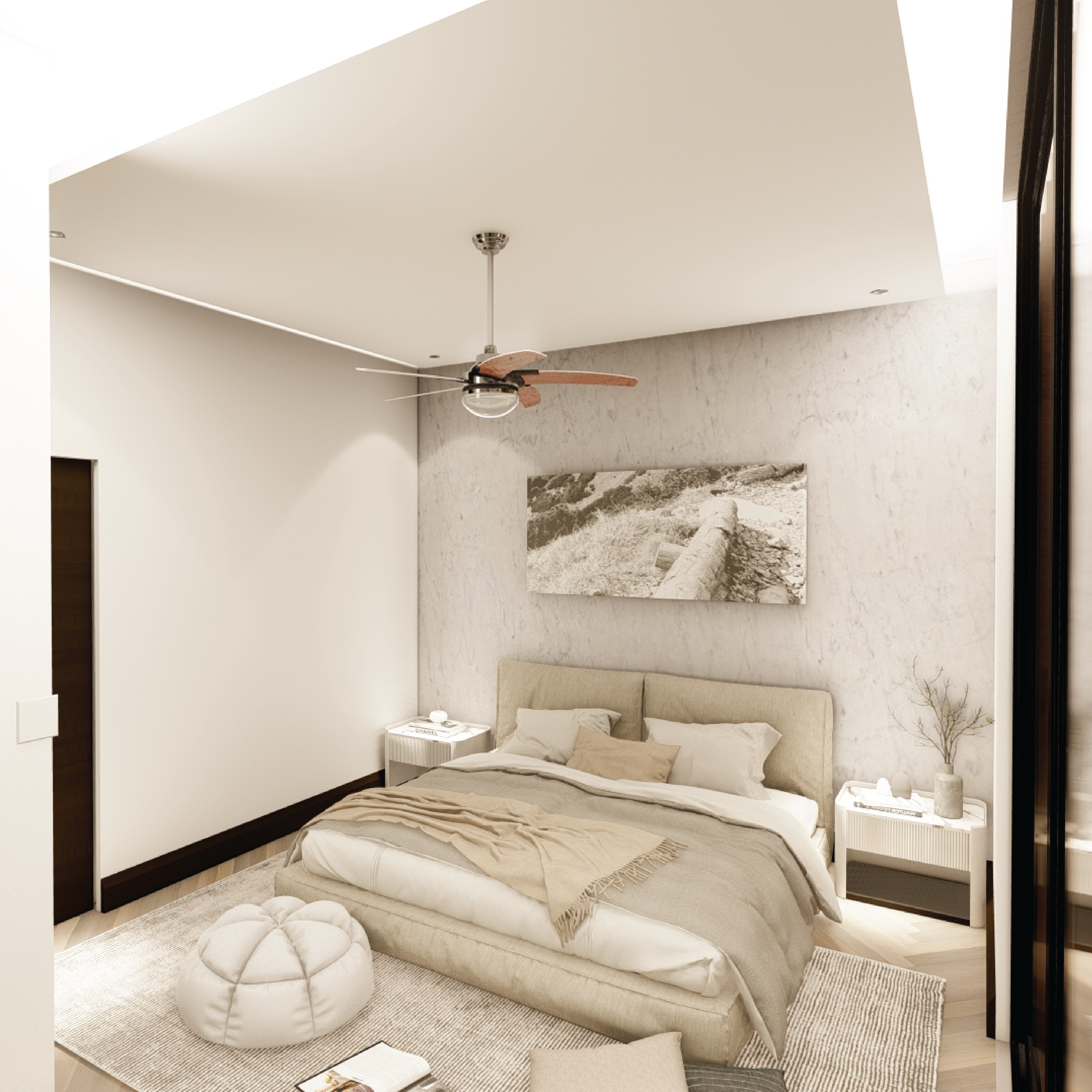 La vivienda cuenta con tres habitaciones. La habitación principal es amplia, con walk-in closet y un baño espacioso, muy iluminado, que incluye ducha y tina. Las otras dos habitaciones, más pequeñas, están pensadas para las visitas esporádicas de los hijos, y comparten un baño también diseñado con especial atención a la iluminación y ventilación natural.