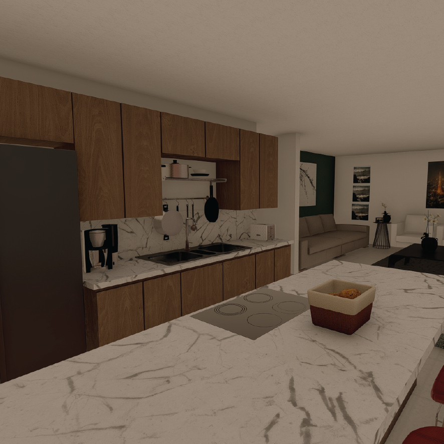 El desafío principal del proyecto Zúñiga Luna radicó en la redistribución de una planta social originalmente estrecha y segmentada. La solución arquitectónica consistió en reubicar la cocina, diseñándola bajo un concepto de isla central que optimiza la circulación en la zona más angosta de la vivienda, permitiendo que la parte más amplia se liberara para una sala de estar espaciosa y confortable.